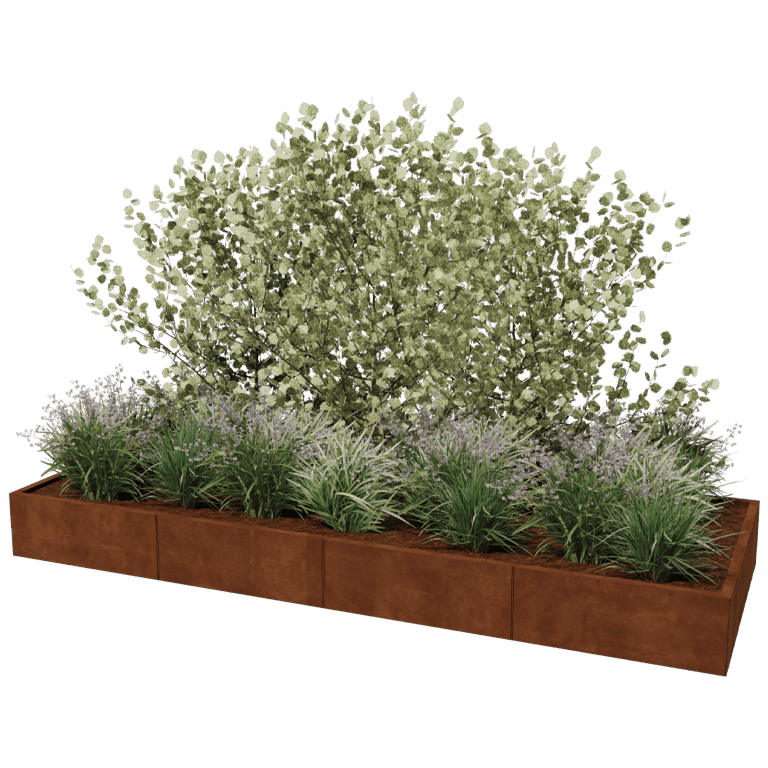 Šis sodinukas yra modulinis plieninis sodinukas, pateikiamas kaip rinkinys. Sodinukas sukonstruotas iš atskirų plokščių ir kampinių dalių. Sodinukus galima sujungti visiškai aklinai. Nematyti jokių tvirtinimo detalių. Dėl mūsų modulinės sistemos galimi ir labai dideli matmenys. Naudojant kampinius elementus galima sukurti unikalias formas, kurių niekur kitur standartiškai nėra. Daugiau informacijos rasite vadove.