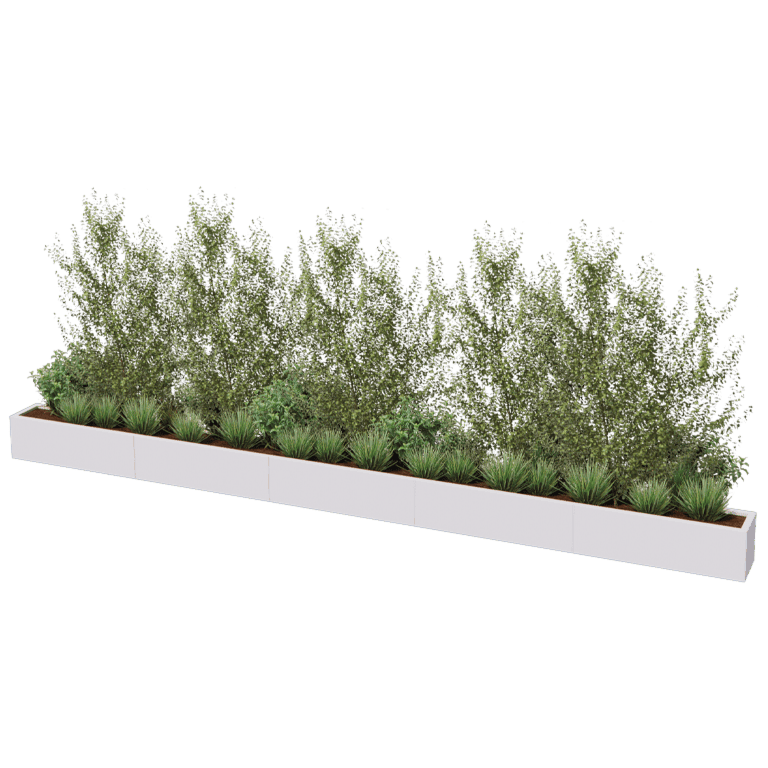 Šis sodinukas yra modulinis plieninis sodinukas, pateikiamas kaip rinkinys. Sodinukas sukonstruotas iš atskirų plokščių ir kampinių dalių. Sodinukus galima sujungti visiškai aklinai. Nematyti jokių tvirtinimo detalių. Mūsų modulinė sistema taip pat leidžia pasiekti labai didelius matmenis. Naudojant kampinius elementus galima sukurti unikalias formas, kurių niekur kitur standartiškai nėra. Daugiau informacijos rasite vadove.