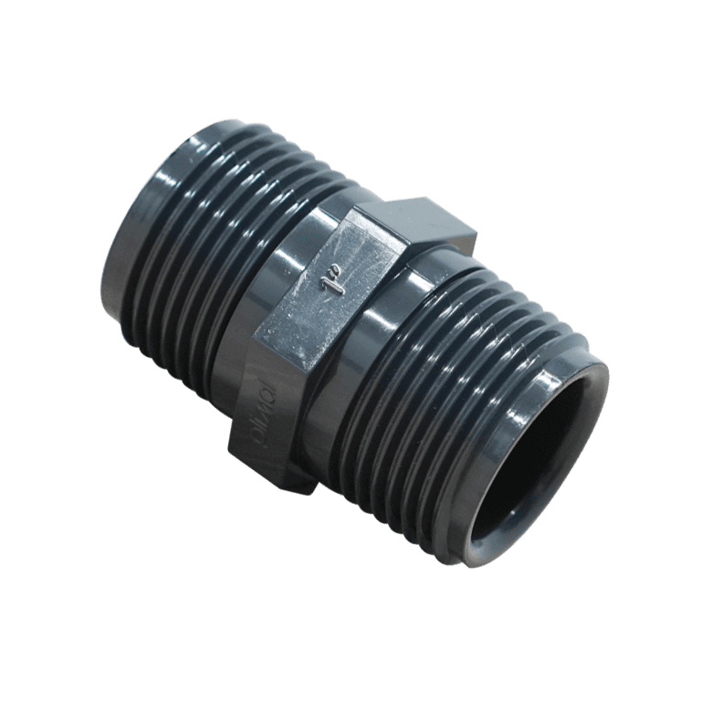 PVC spaudimui srieginė nipelė su dviem 1 colio išorinėmis srieginėmis jungtimis naudojama vandens staliuko vamzdynų sistemos dalims sujungti. Tai praktiška detalė tvirtam ir patikimam sujungimui.